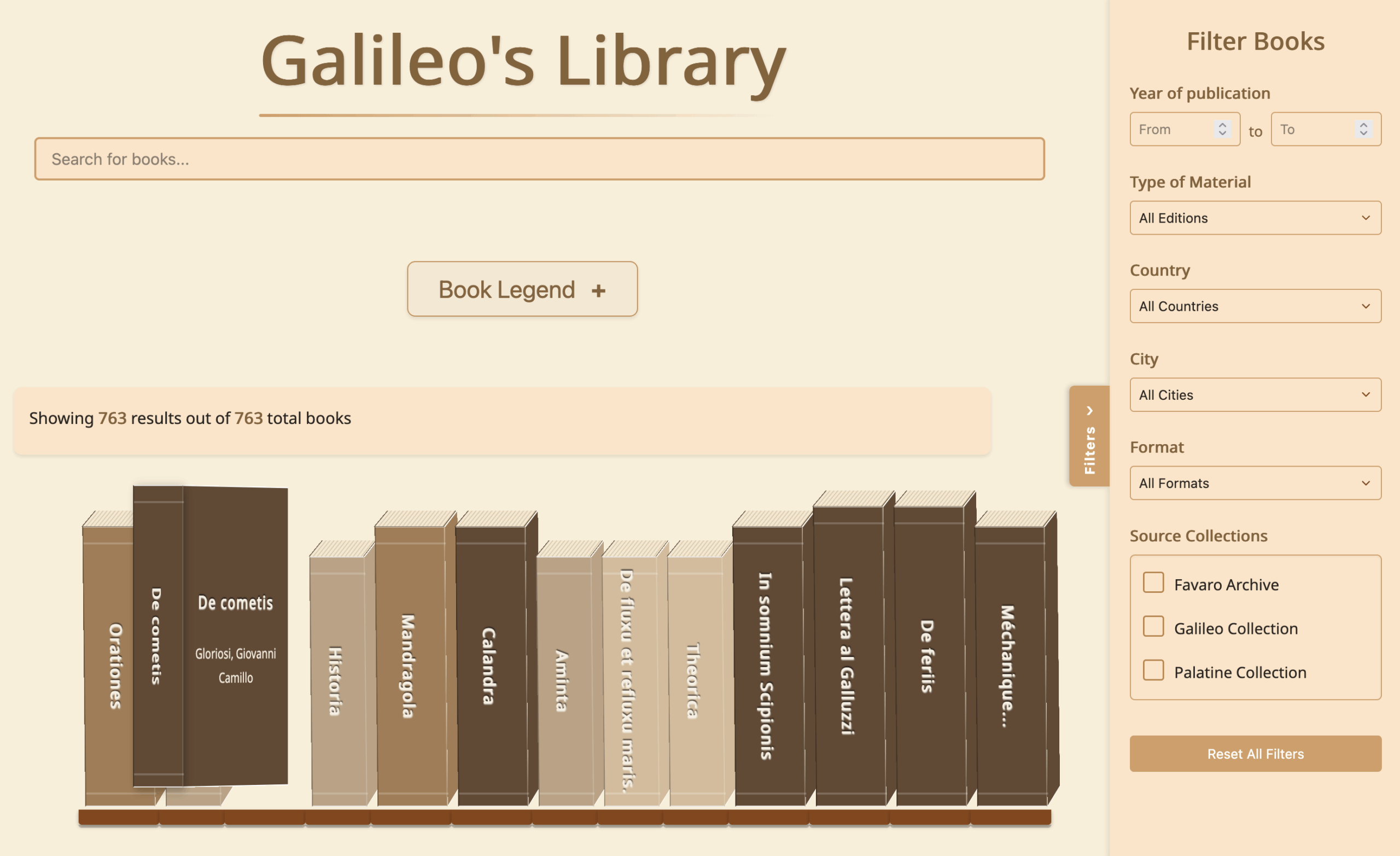 Filter menus (right) for the interactive visualization of Galileo’s Library