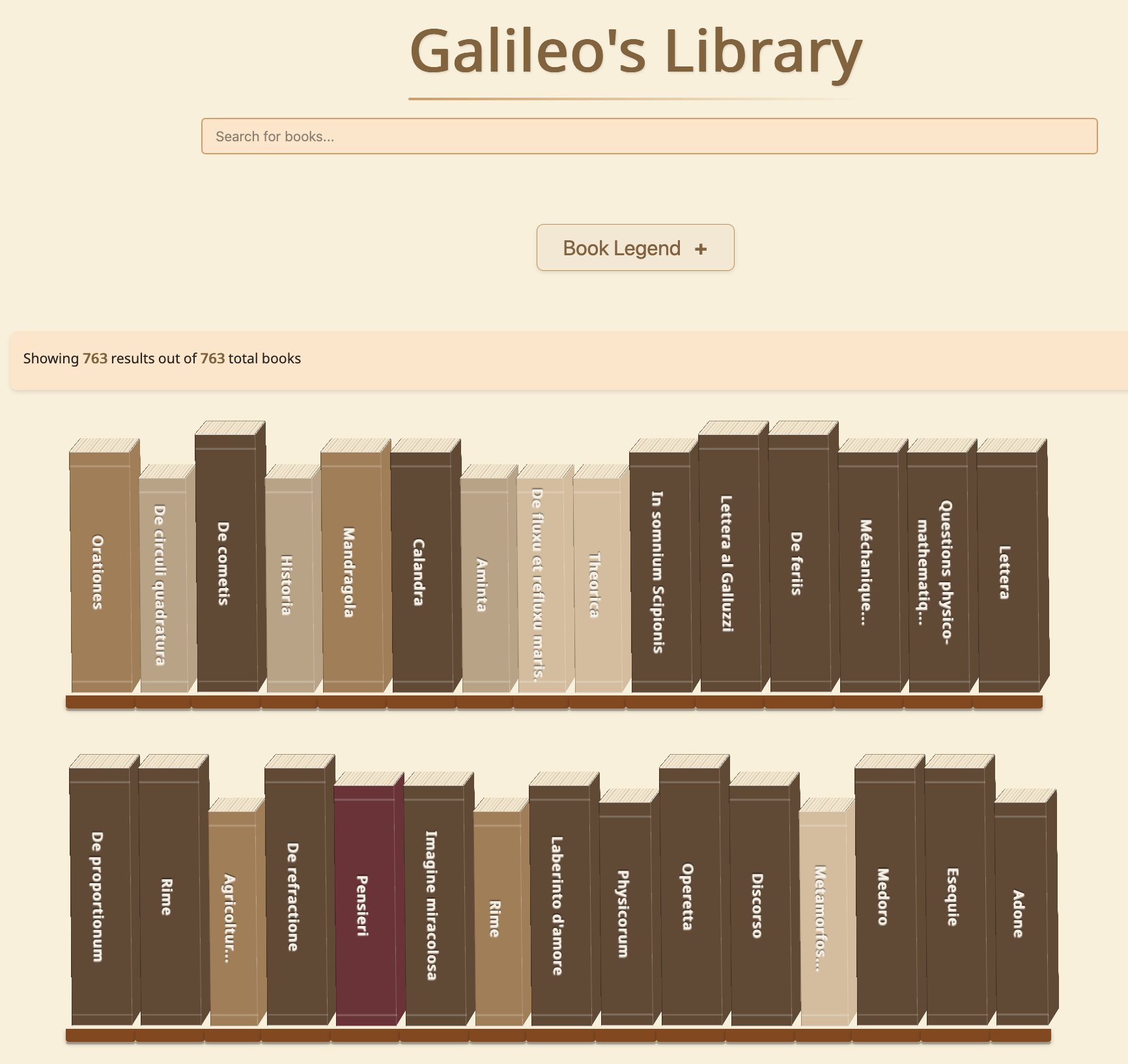 Building on the themes of interactivity and customization that I explored in Galileo’s Virtual Library, I worked with a DCS-Computer Science major, Yassine Khayati ’25, in Spring 2025 to explore different options for visualizing the collection of books and manuscripts associated with Galileo and his family. The result is “Galileo’s Library,” a dynamic visualization that responds to users’ filters and searches. The site was meant to be a prototype for the visualizations that could complement the forthcoming book, and a way to make a research tool for the collection. Before creating the visualizations that can be found at the links below, the main entry point for the data is a search bar linked to a data set maintained by the Museo Galileo. Advanced search options are limited to name, title, or subject. That empty search bar is a perplexing thing for someone new to a digital resource. It is a door to a data set. If I am curious about what the overall collection represents, but I do not already know specific authors, topics, or titles, how do I enter? Since (digital) humanists capitalize on contextualization, are keen observers of patterns and outliers, and excel at creating focused sets of documents to analyze and compare, I wanted a tool that first emphasized attributes and features, similarly to Galileo’s Virtual Library.
